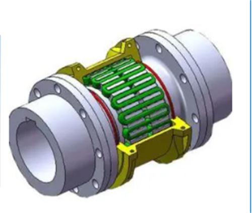 (2)撓性聯(lián)軸器:又分為齒套式和蛇形彈簧式兩種。齒套式聯(lián)軸器用套微的內(nèi)齒分別與兩個(gè)齒輪嚙合,使兩個(gè)轉(zhuǎn)子聯(lián)接起來。它的優(yōu)點(diǎn)是有一定的活動(dòng)性,可以消除和減弱振動(dòng)的傳遞,對(duì)轉(zhuǎn)子中心要求不很高,不傳遞軸位移,但必須在運(yùn)轉(zhuǎn)時(shí)通入潤滑劑,檢修和安裝要求質(zhì)量高。蛇形彈簧管聯(lián)軸器是在兩個(gè)被連接的對(duì)輪的外緣銑出的類似漸開線的牙齒上,沿園周嵌入若干彈性剛帶制成的蛇形彈簧,把兩個(gè)對(duì)輪聯(lián)接起來。優(yōu)點(diǎn)是:能避免傳遞振動(dòng),又允許轉(zhuǎn)子有較大的中心偏差和軸向位移。但結(jié)構(gòu)復(fù)雜、傳遞力矩小,運(yùn)行中需要潤滑。